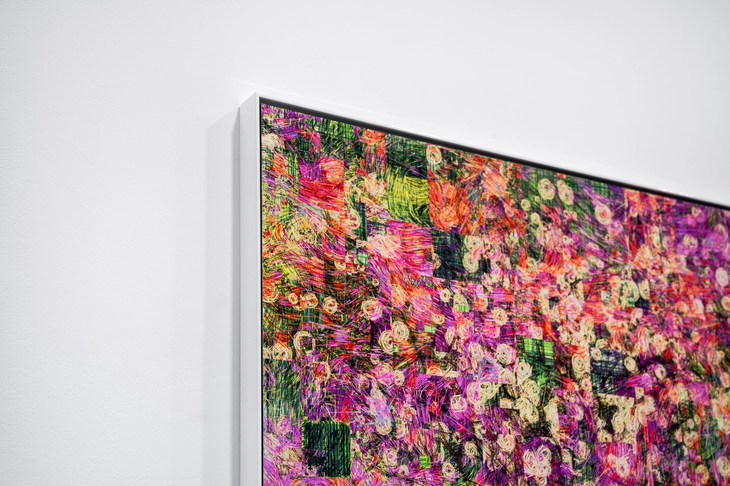 For the exhibition, I’ve curated 10 physical pieces specifically created to be viewed in a gallery context. These curated artworks were generated at distinct moments during my creative exploration, capturing particular algorithm states, visual states or experiments.
