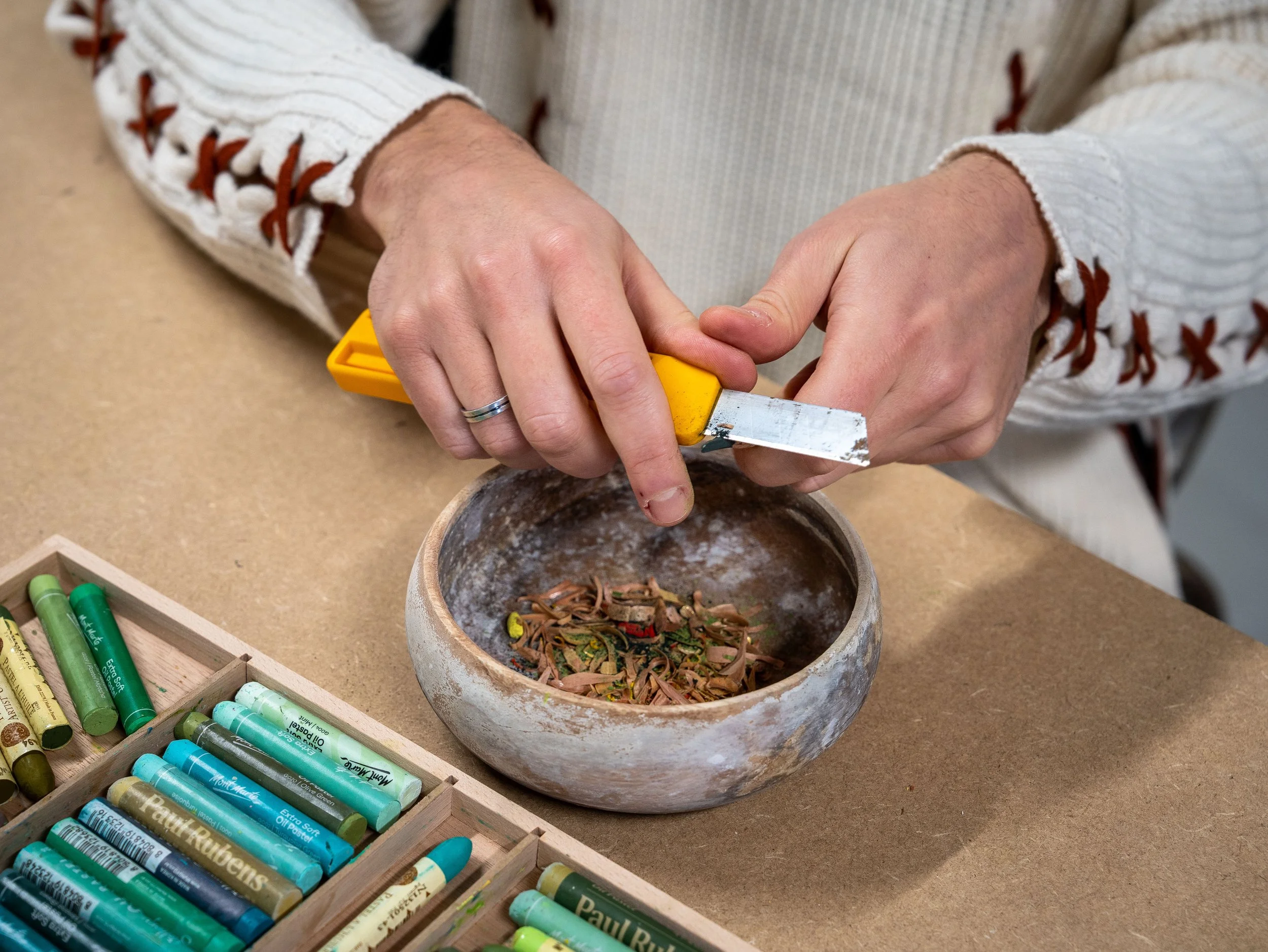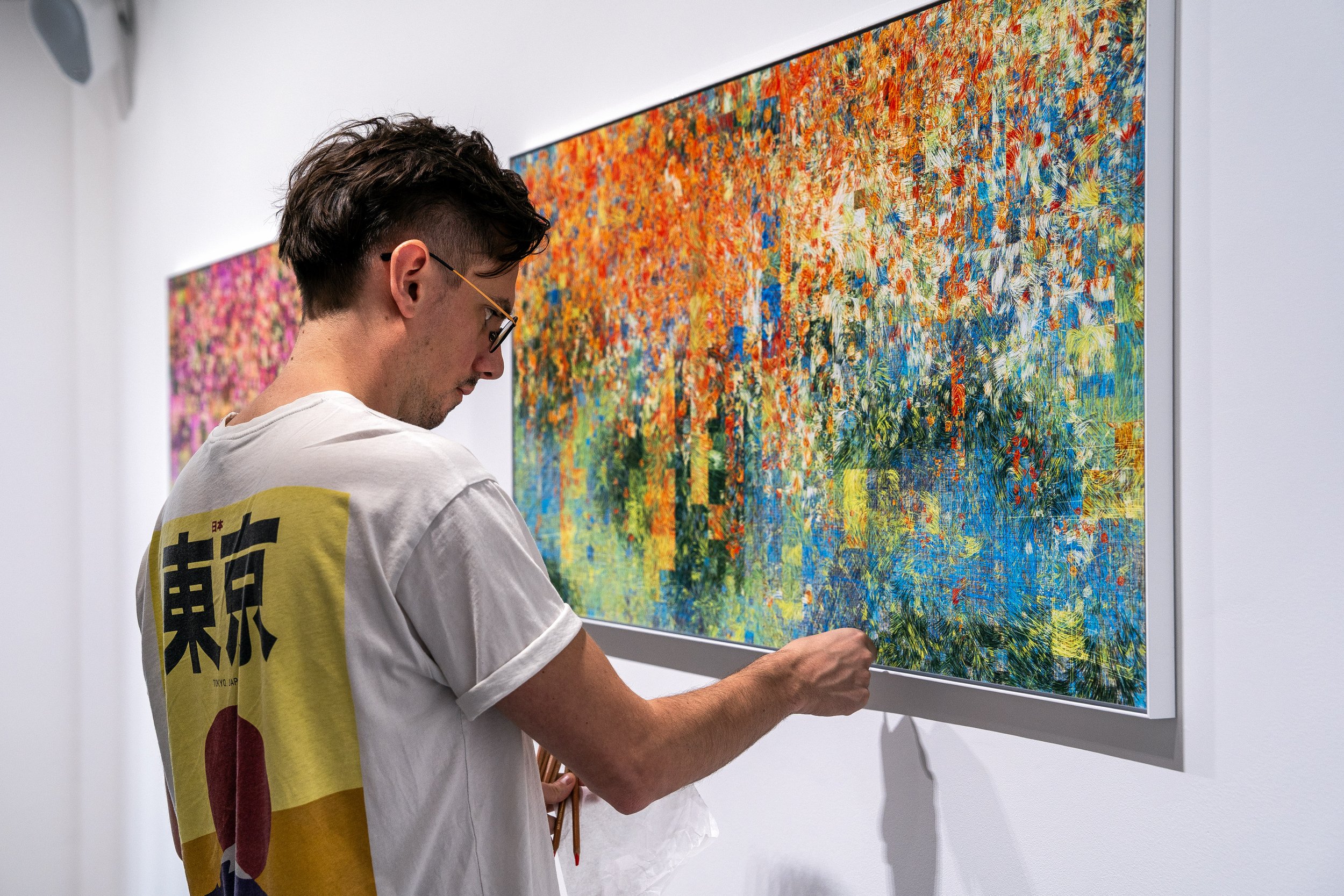 My creative process blends generative algorithms with hand-crafted details, connecting digital exploration with physical expression. I first generate each artwork digitally, meticulously layering millions of lines and carefully selected color palettes, influenced by seasonal changes and personal feelings. Afterwards, I print these digital pieces onto paper, adding depth and texture by hand using dry pastel and oil pastel.